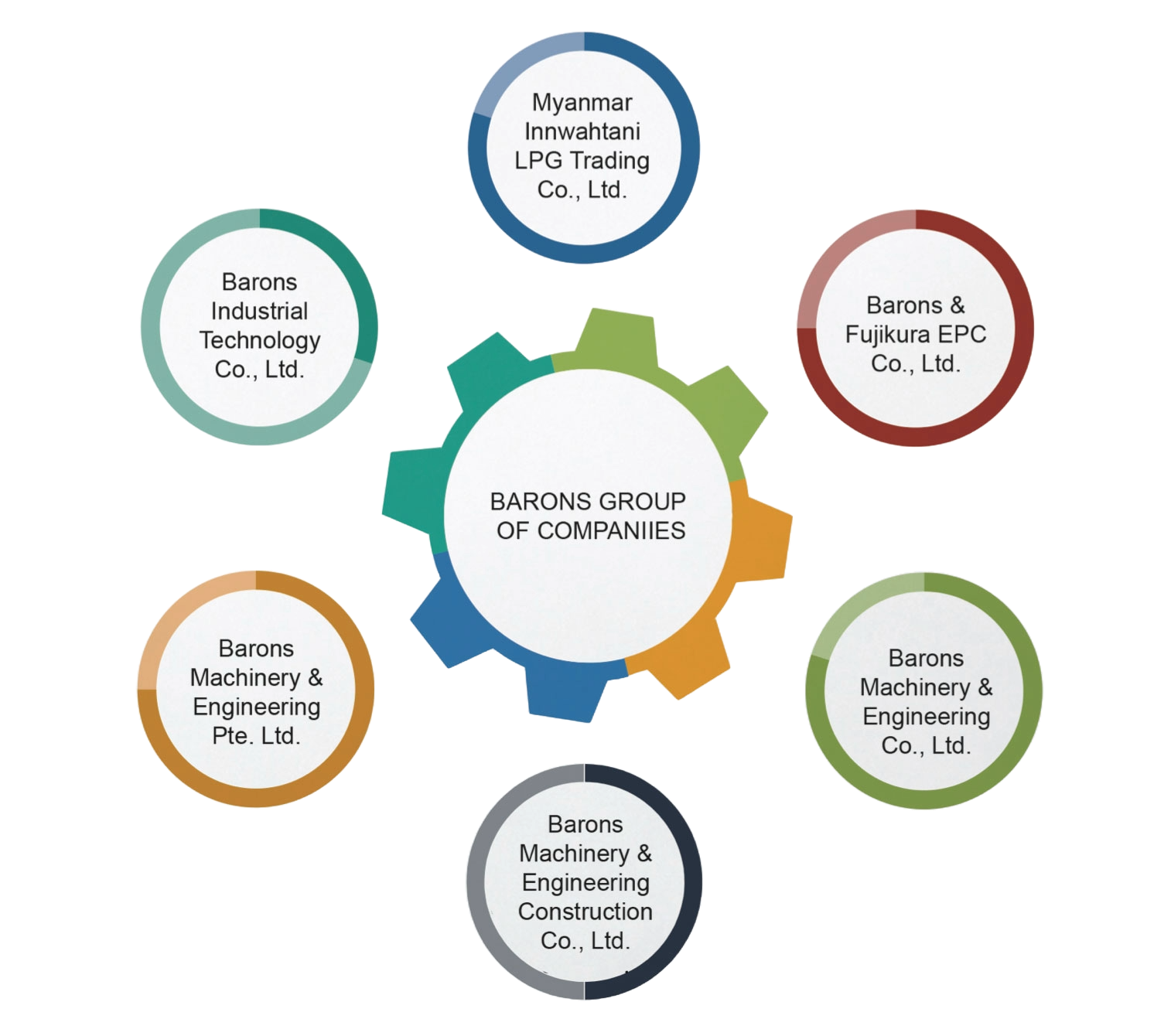 Barons Group of Companies comprises of following compa-nies with specialist quality of service in each sector Barons Machinery & Engineering Co., Ltd, Barons Machinery & En-gineering Construction Co., Ltd, Barons Industrial Technolo-gy Co., Ltd, Barons Machinery & Engineering Pte Ltd, Myan-mar lnnwahtani LPG Trading Co., Ltd etc.